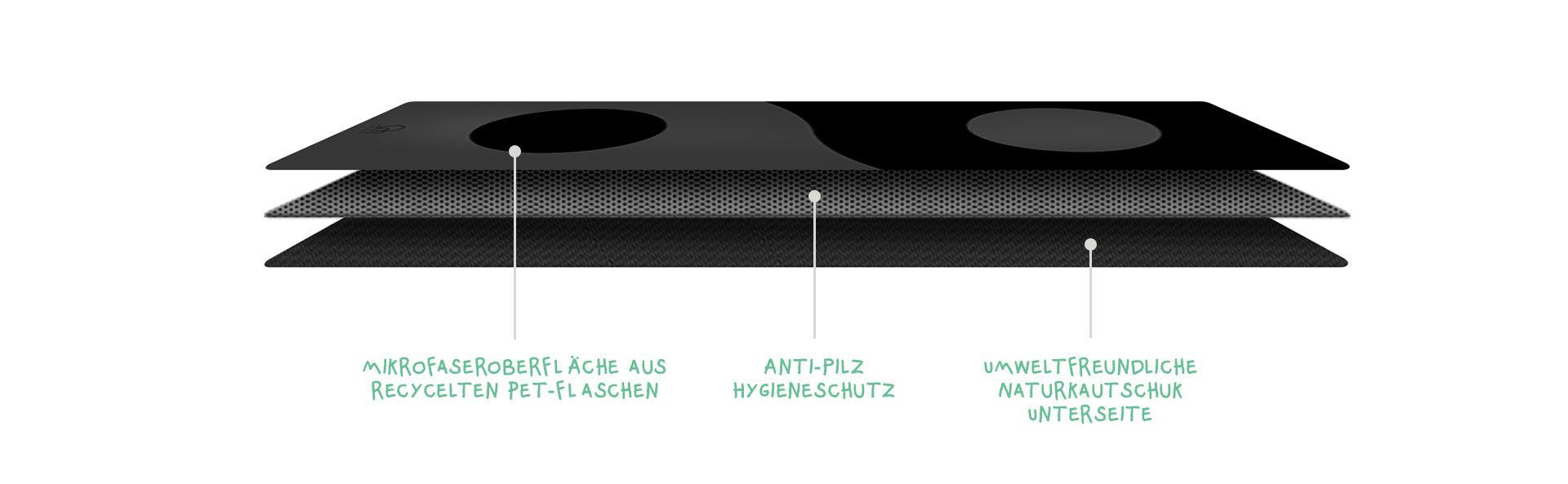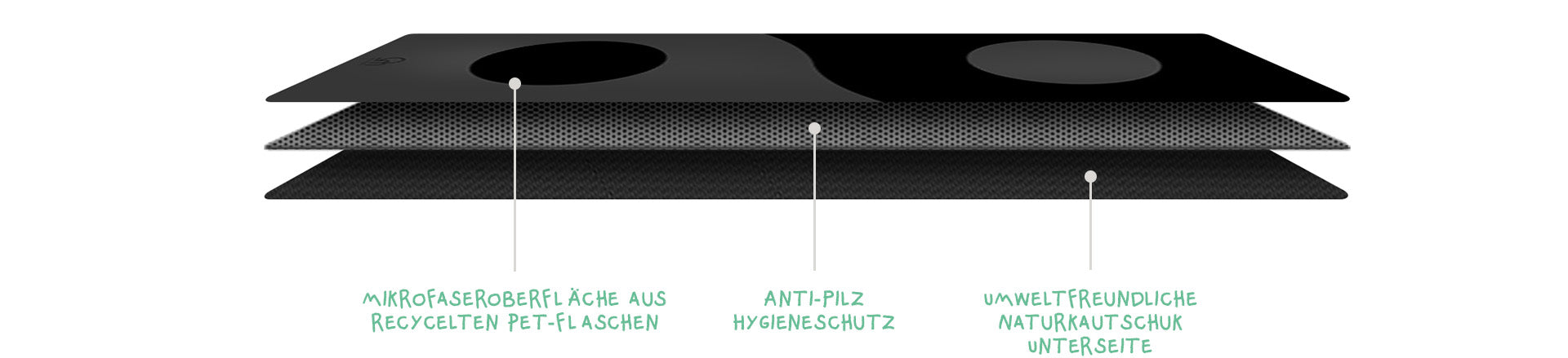 die oberfläche der yogamatte besteht aus mikrofaser. diese ist nicht nur saugfähig und trocknet schnell, sondern verbessert auch den grip, je mehr du schwitzt.